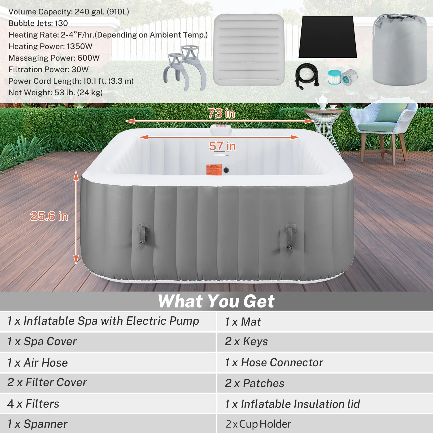 73in Square Hot Tub for 4-6 Person, Seizeen Inflatable Hot Tub Home SPA for Outdoor, 910L Capacity, 130pcs Massage Jets, w/4 Filters, Lockable Cover, Storage Bag, 2 Cup Holder, Gray