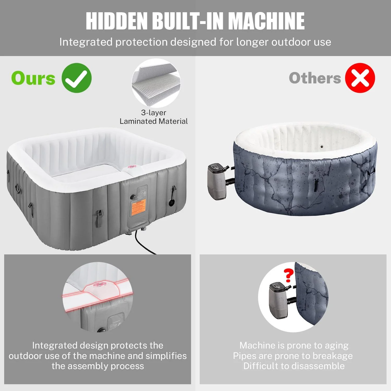 • Built-in Control Panel: The hot tub features an integrated electric air pump and control box for easy operation, with a thickened PVC shell for outdoor durability.